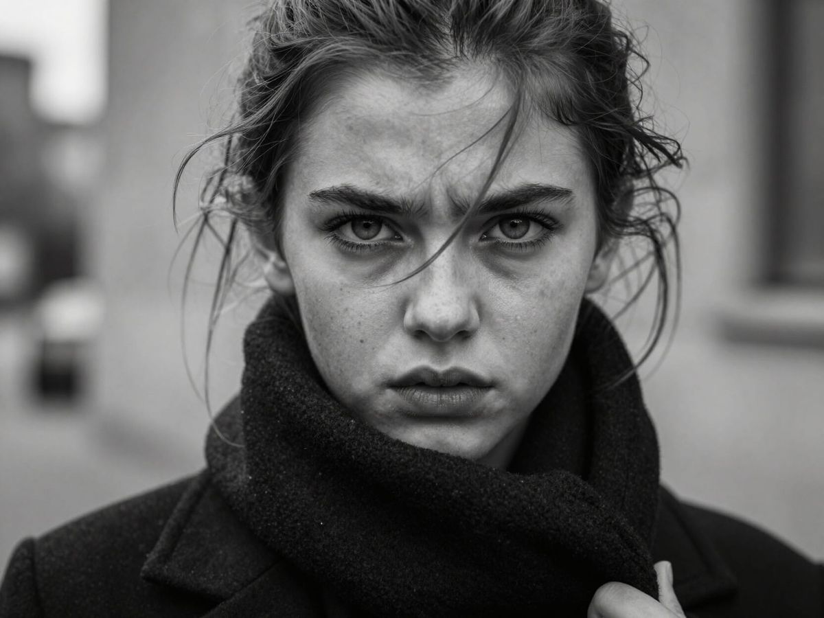 A hyperrealistic black and white close-up portrait of a defiant young girl with intense eyes and windblown hair. Cinematic lighting and a shallow depth of field create dramatic focus.