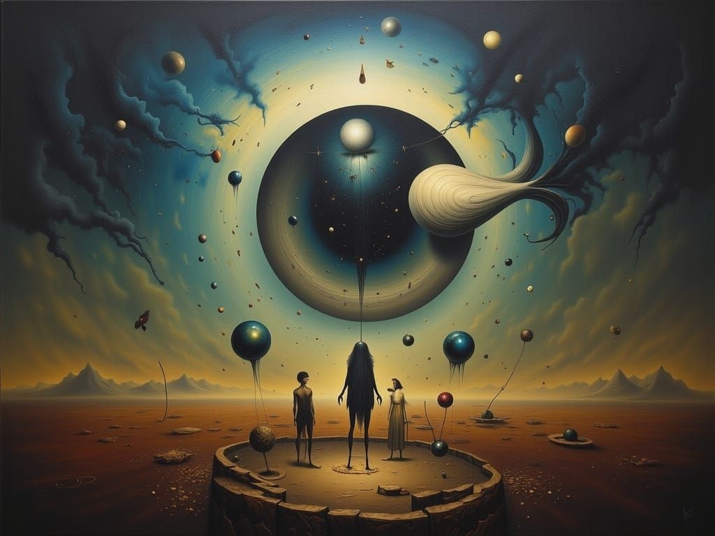 Do not let the darkness cling to your eyes. Intensely surreal imagery and atmosphere, hypnagogia, clarity within distortion, existential, liminal, clinical depression, psychosis, dissociation, a mixture of 20th century Surrealist influences, Rembrandt lighting, rich textures, oil on canvas. <lora:STRANGE ...