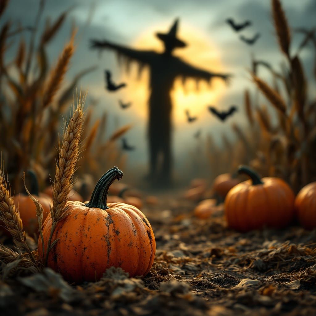 This image depicts a spooky harvest festival scene featuring haunted corn mazes, ghostly scarecrows, and illuminated pumpkin patches. A macro view of a pumpkin and rotten wheat is in the foreground, with crawling shadows in the background.