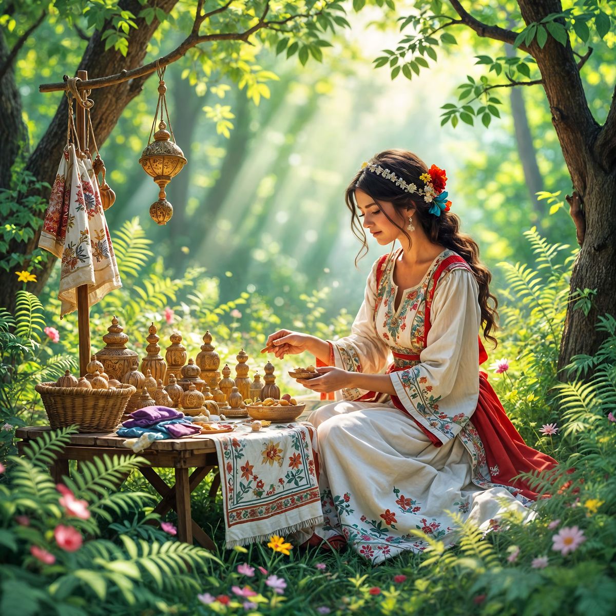 A whimsical scene of a woman in a flowing, culturally fused outfit, selling intricately carved wooden toys and shimmering fabrics.
