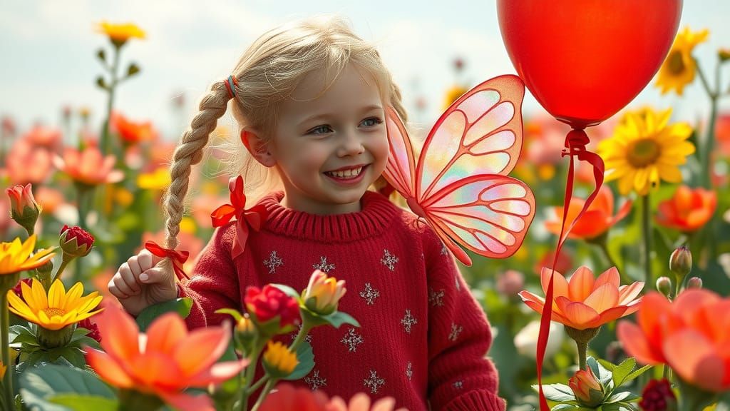 This image depicts a young girl playing in a vibrant, sun-drenched garden, surrounded by colorful flowers and a magical creature with iridescent wings. She wears a well-loved red sweater with intricate embroidery and grasps a scarlet balloon.