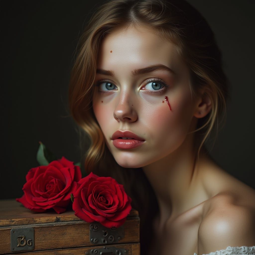 Uma mulher de beleza impressionante, com cabelos soltos e ondulados, está retratada em um primeiro plano que captura a profundidade de sua expressão emocional. com um objeto antigo com a inscrição "BG". Seus olhos, de um azul intenso e penetrante, estão levemente lacrimejados, com lágrimas brilhando ...
