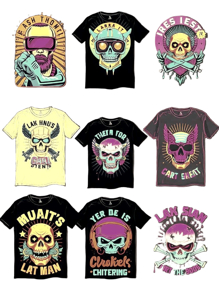 This image collection features colorful, retro-style illustrations of T-shirt designs for men, women, and kids, blending neon-lit graphics, distressed textures, and playful, hand-drawn elements reminiscent of 80s and 90s fashion.