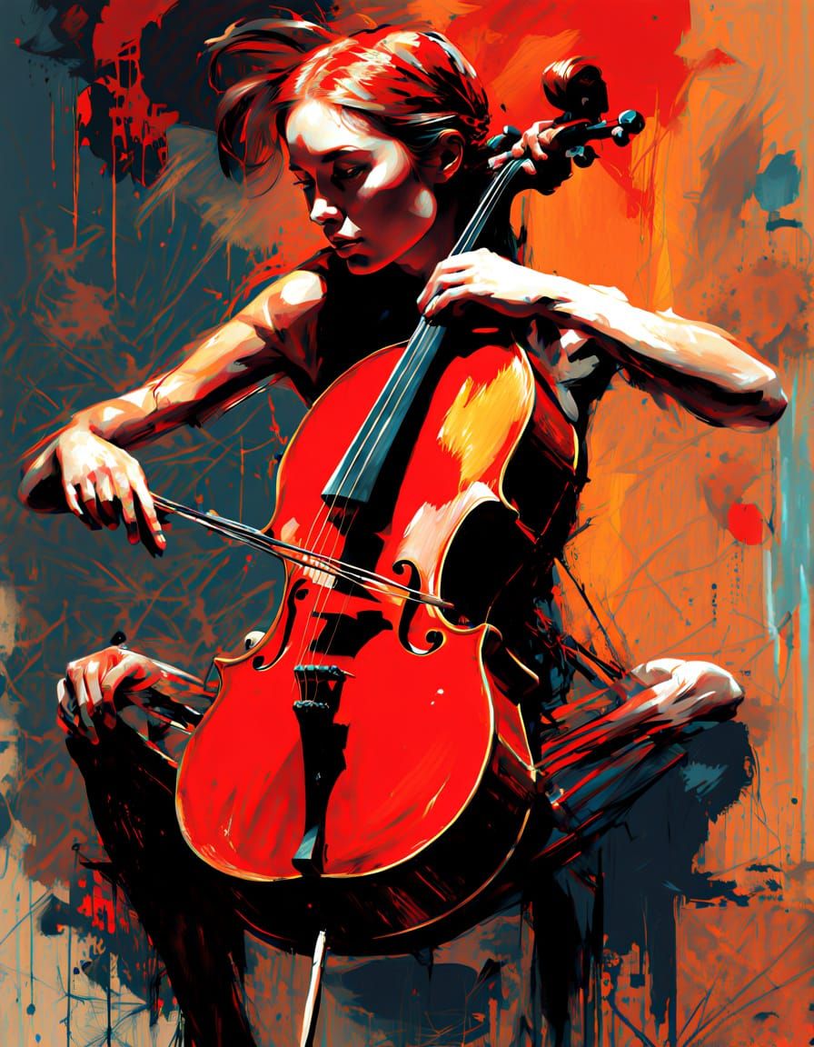 A vivid oil painting of a woman playing cello in a moonlit alley. The close-up shot, rendered in an impressionist style, captures the scene's harmonious colors and deep shadows.