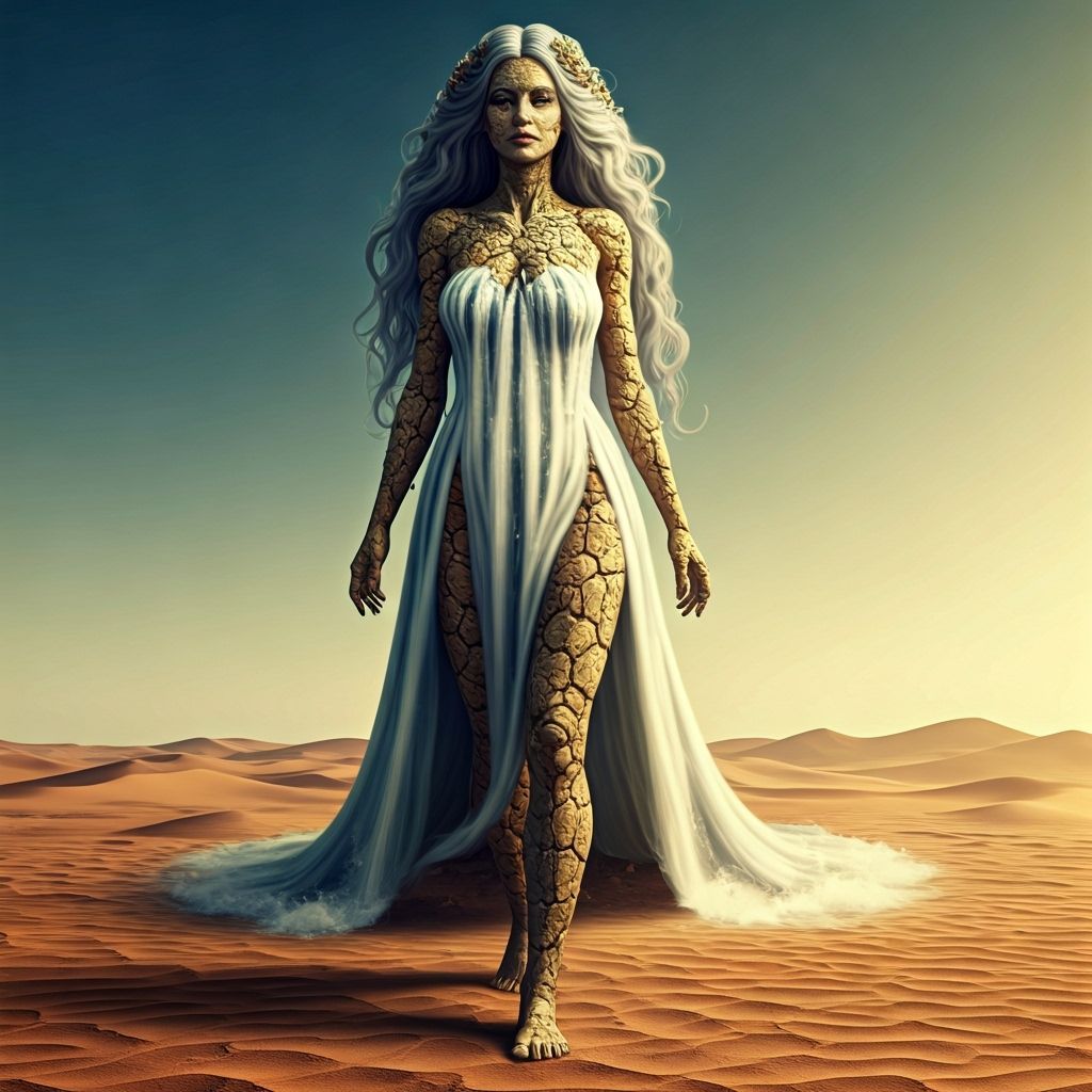 This image shows a stone giantess with waterfall hair and dress walking in a desert. The water from her hair and dress creates an oasis at her feet. The image is photorealistic and highly detailed.