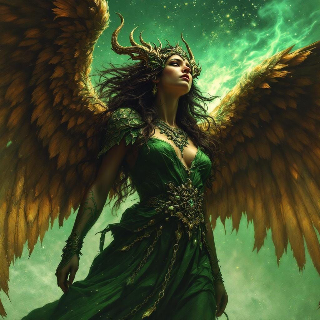 This image shows a detailed portrait of Admael, a fantasy archangel. The artwork features a deep green and brown color palette, evoking a sense of nature and guardianship.