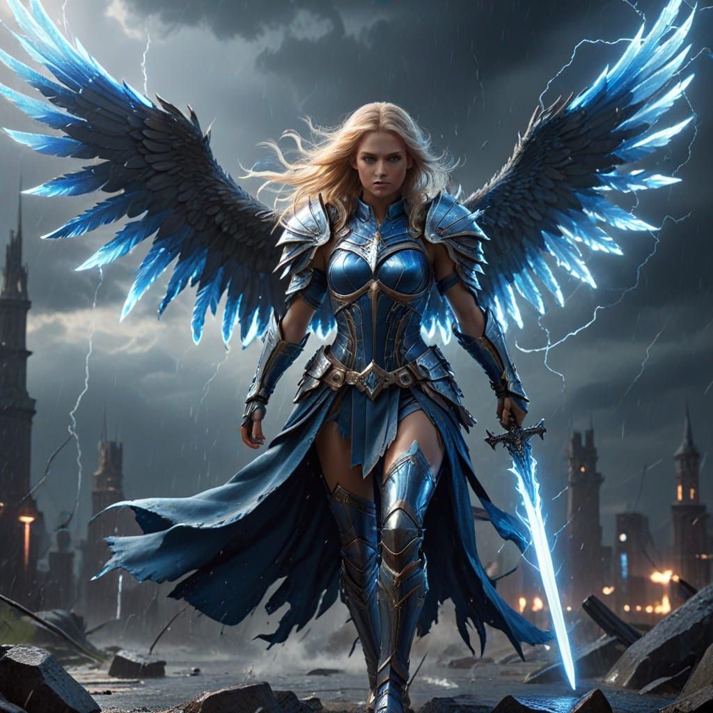 This image shows a beautiful angelic warrior woman striding forward heroically amidst a thunderstorm. She has large feathered wings, long flowing hair, and wears detailed armor, as rendered digital art.