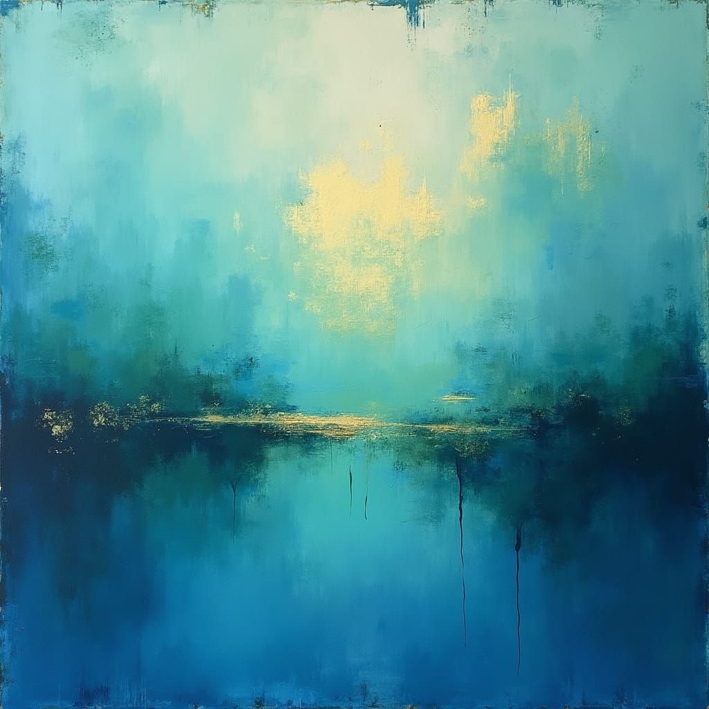 This image shows an abstract gradient of blue, green, and gold. The soft, feathery brushstrokes and subtle textures create an ethereal, dreamy aesthetic in the style of abstract expressionism.