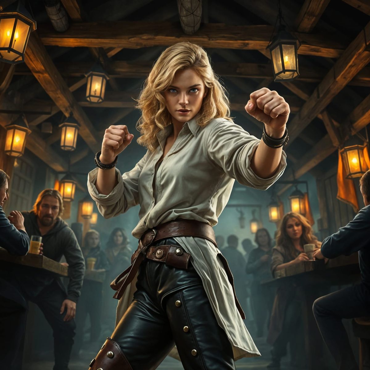 A fierce female warrior stands poised for battle in the heart of a medieval fantasy tavern, surrounded by rowdy patrons and the dim glow of lanterns.
