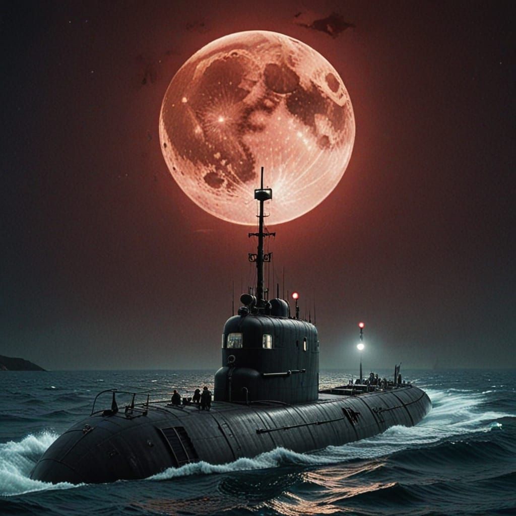 This eerie image depicts a spectral World War 2 submarine lurking in the treacherous Devil's Sea beneath a haunting blood moon. A chilling maritime scene.
