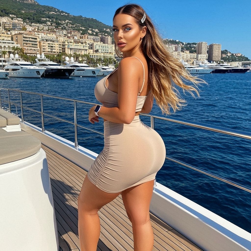 This image shows a stunning young woman posing on a yacht against the Monte Carlo skyline. She exudes confidence and grace, with striking blue eyes and sun-kissed skin. Her hair flows in soft waves, accessorized with a delicate golden chain.