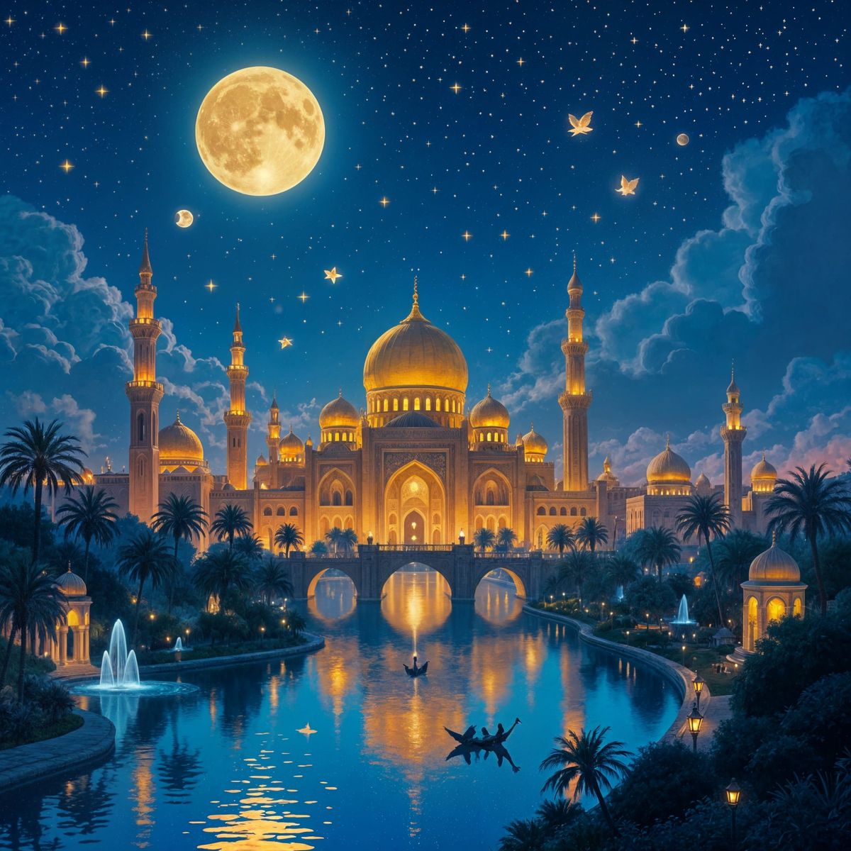 A fantastical vision of Baghdad under a starry night sky, golden domes and ancient towers glowing with soft magical light, the Tigris river shimmering like liquid silver, flying carpets drifting above the city, enormous moon and glowing constellations illuminating the skyline, mystical lanterns floating in the air, exotic gardens with palm trees and fountains, cinematic, ultra detailed, dreamlike, majestic and enchanting, fantasy art, animated style
