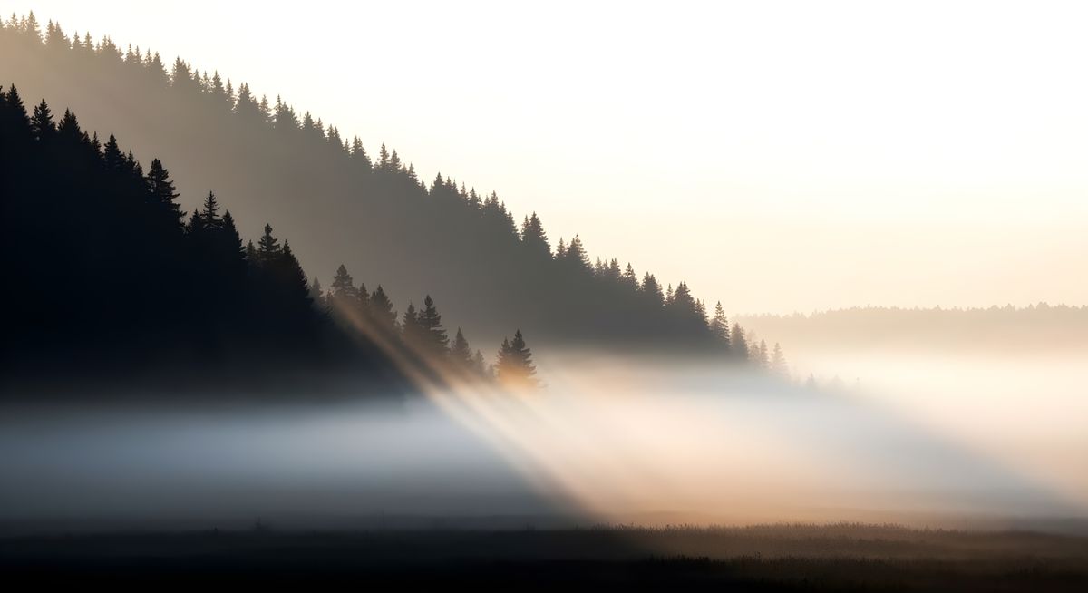 This image shows a charcoal drawing of a foggy forest silhouette with a long shadow on a textured white background. Warm sunset hues create a tranquil atmosphere, rendered in expressive oil and impasto acrylic styles.