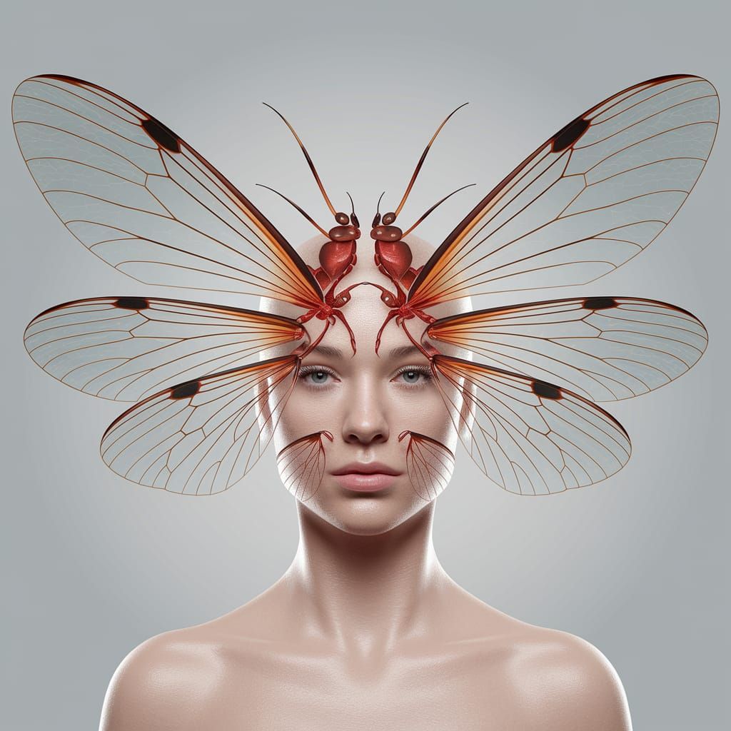 A surreal portrait of a woman's head composed of transparent insect wings. The image features a double exposure effect and intricate face tattoos, rendered with soft colors.