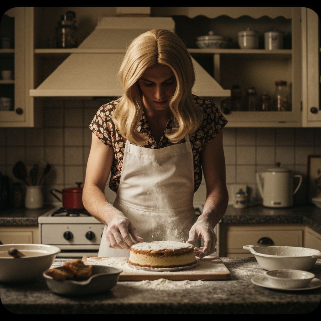 A young man in a minidress bakes a cake in a detailed 1950s kitchen, captured in a cinematic, atmospheric film still with vibrant colors and dramatic lighting.