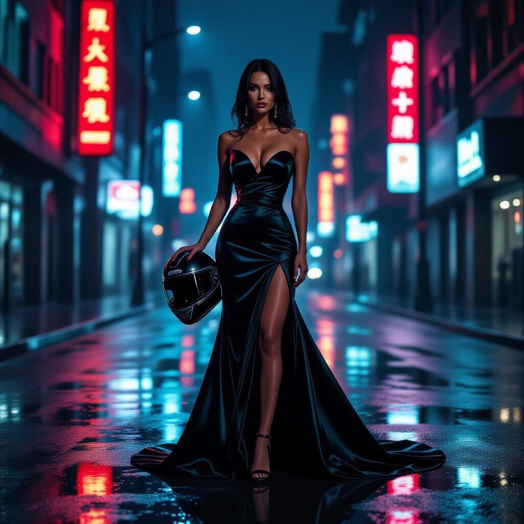 A striking woman in a futuristic gown holds a vintage helmet on a neon-lit, rain-slicked street. Moody, cinematic lighting and sharp contrasts create a dramatic, atmospheric scene.