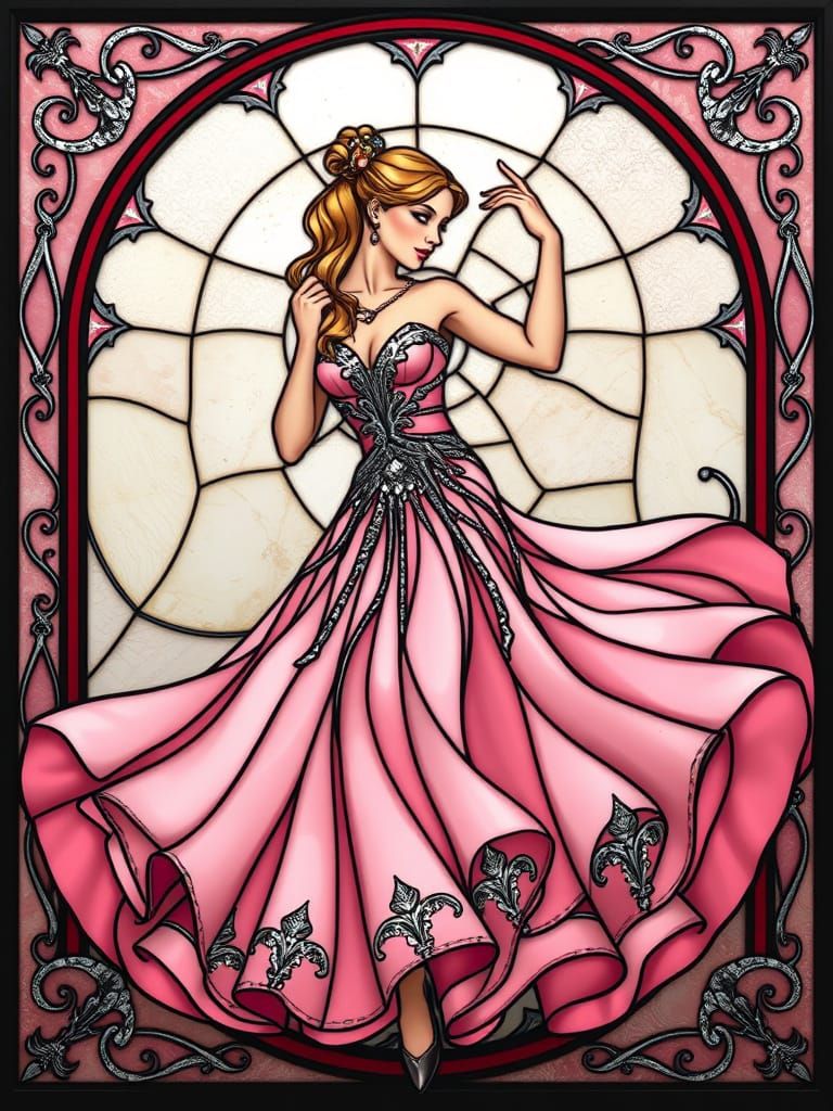 This image shows a woman in a ballroom gown, rendered in an art nouveau stained glass style. The design features flowing curves, pink hues, silver metallic accents, and detailed leadwork.