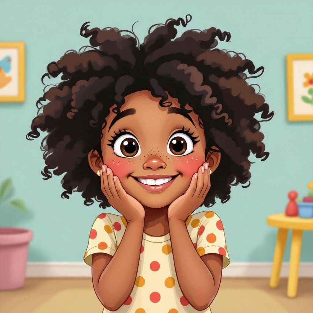 This image shows Zuri, a young African girl with a surprised expression, in a colorful playroom. The illustration features soft watercolor and cartoon elements. It captures a children's storybook aesthetic.