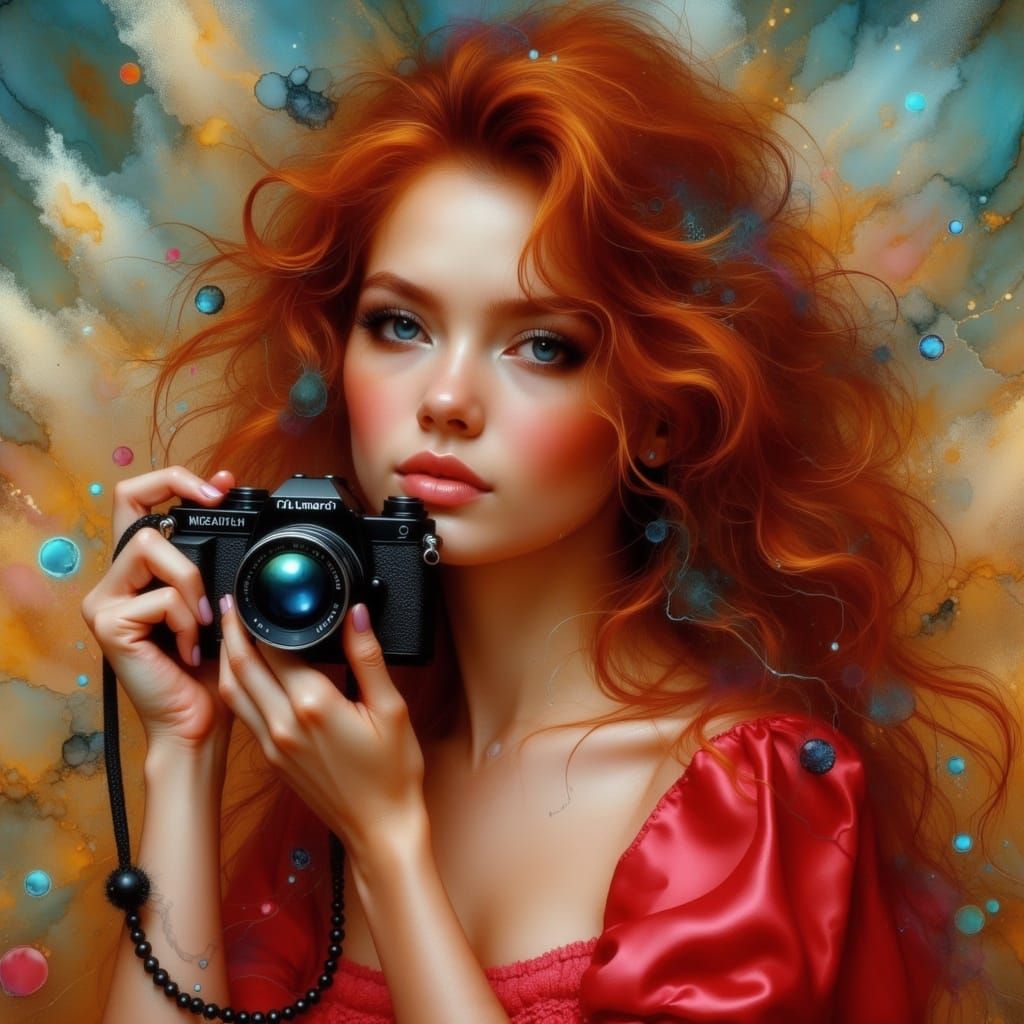 A serene portrait of a young woman with fiery red hair and piercing blue eyes, holding a camera to capture the beauty of nature in a warm, sunny atmosphere, reminiscent of Pre-Raphaelite paintings with a touch of whimsy and romanticism.
