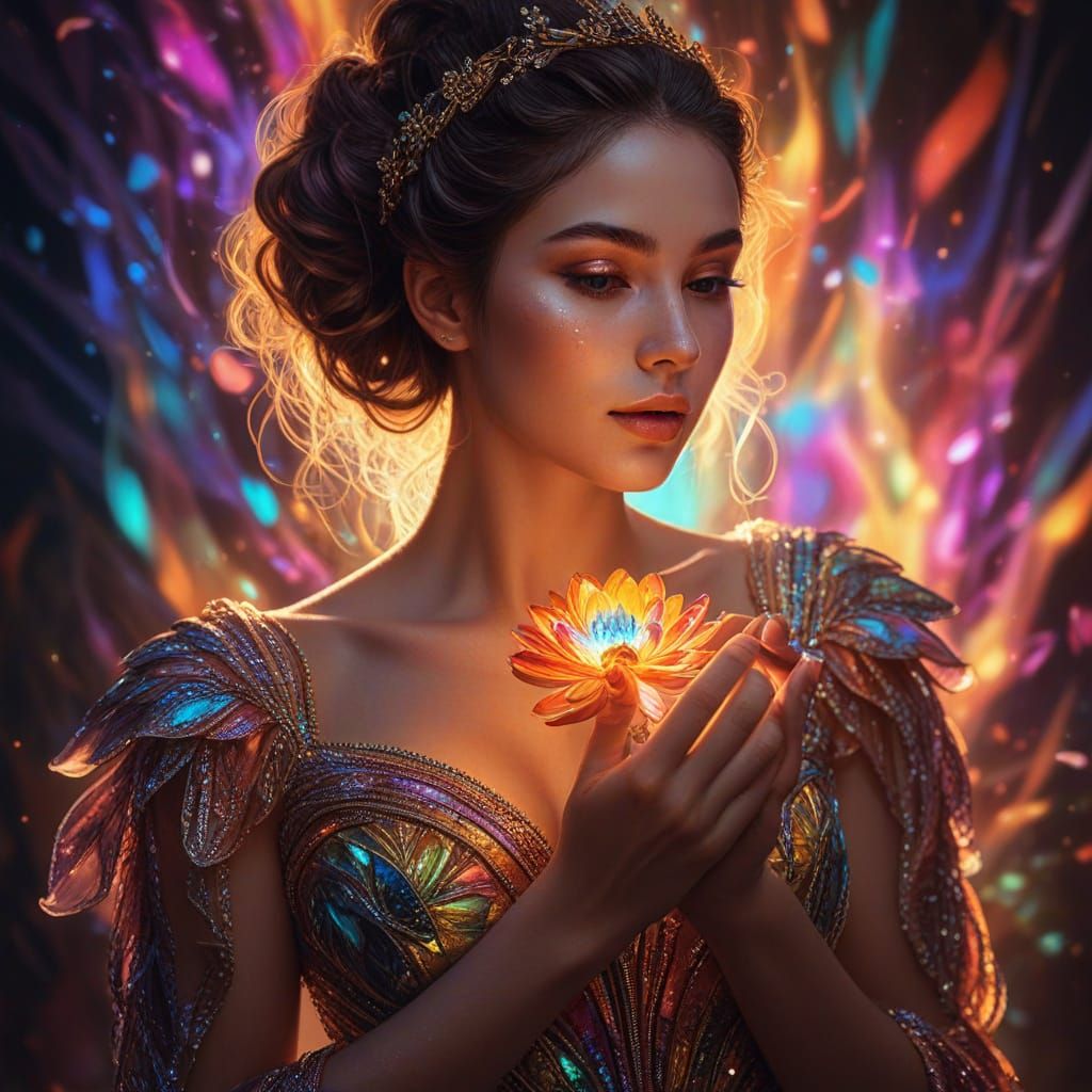 This stunning image captures a captivating woman in a romantic, neon-lit gown, surrounded by shimmering iridescent flower petals and soft, golden light, evoking a sense of otherworldly beauty and high-fashion elegance.