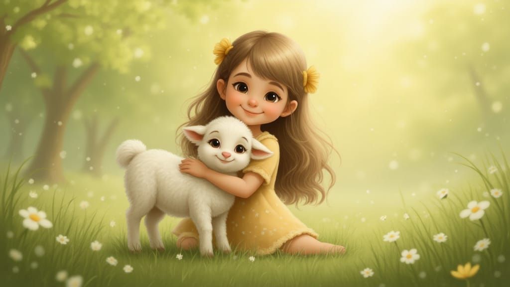 This image shows an adorable young girl hugging a white lamb in a meadow. The innocent scene is depicted in soft pastel colors and bathed in gentle morning light.