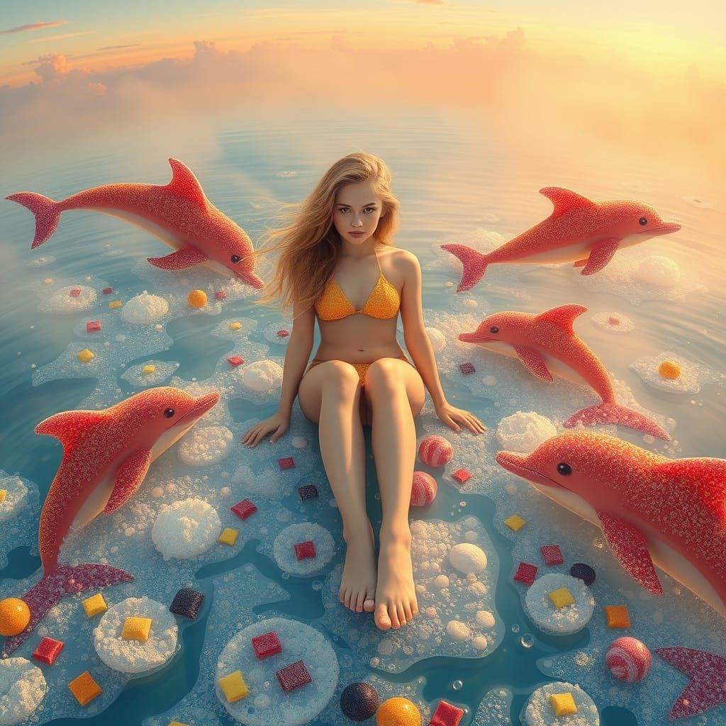 This image shows a golden-haired woman floating on soda surrounded by candy dolphins. It has a dreamlike quality with vibrant colors and textures, reminiscent of digital art.