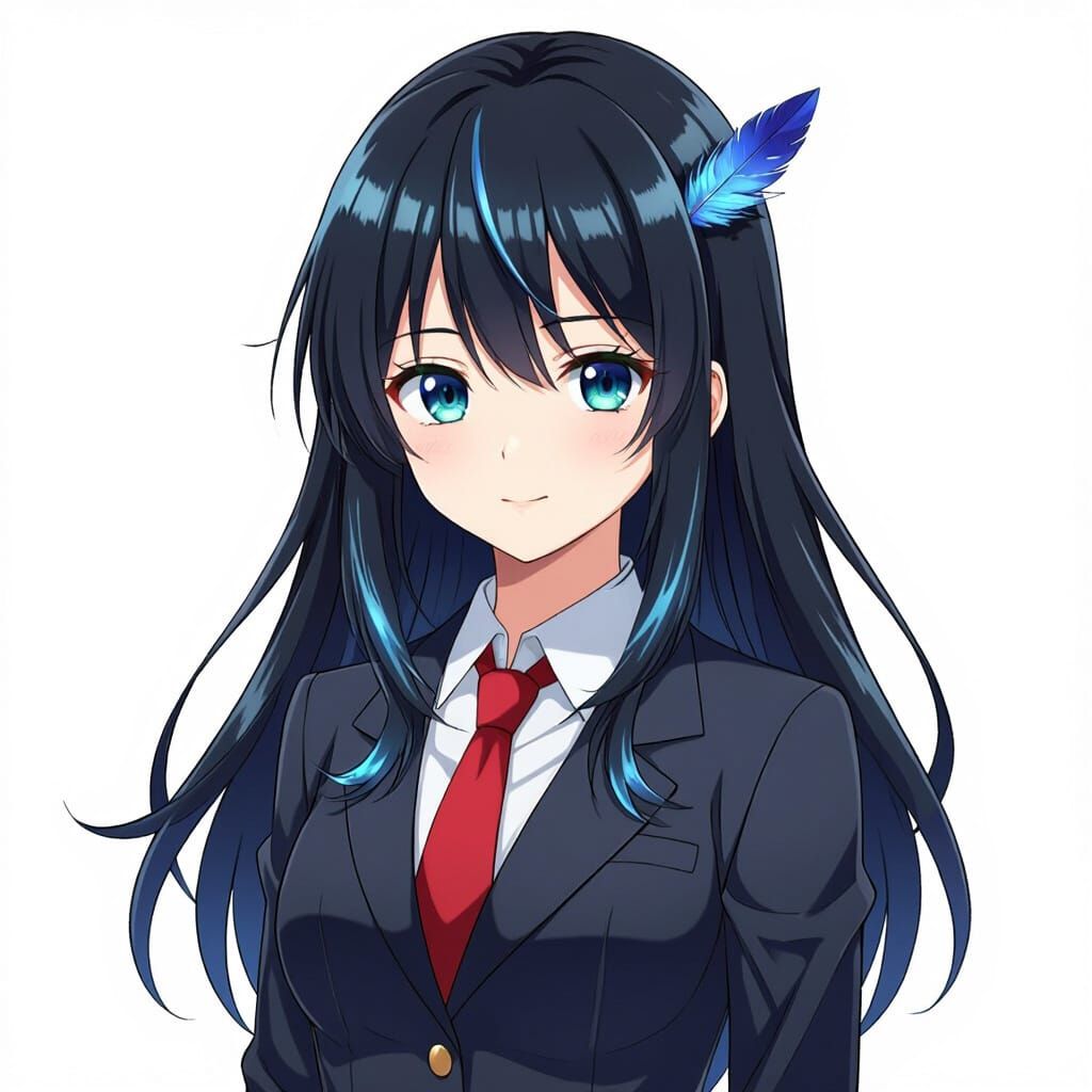 A 15-year-old Japanese student named Karasu with black hair featuring blue highlights. She wears a school uniform, rendered in a vibrant anime art style with soft lighting.