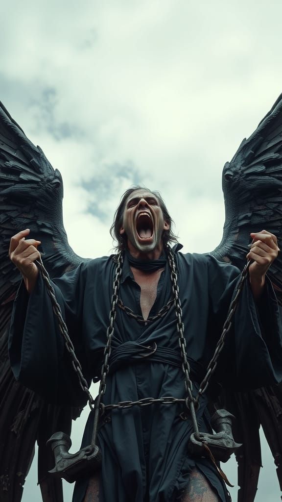 A haunting, low-angle photorealistic image of an undead death angel, restrained by iron chains, with massive dark wings outstretched, conveying a sense of sorrow and epic despair in a dark, eerie atmosphere