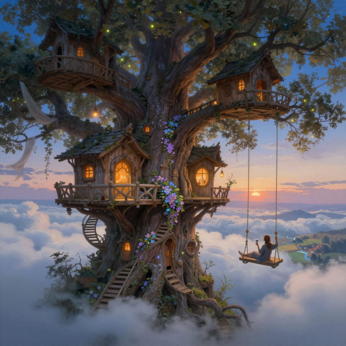 This luminous oil painting showcases an elaborate treehouse village built into a giant ancient tree, rising majestically above a cloud layer. Elven craftsmanship features organic architecture, rope bridges, and warm, glowing lights.