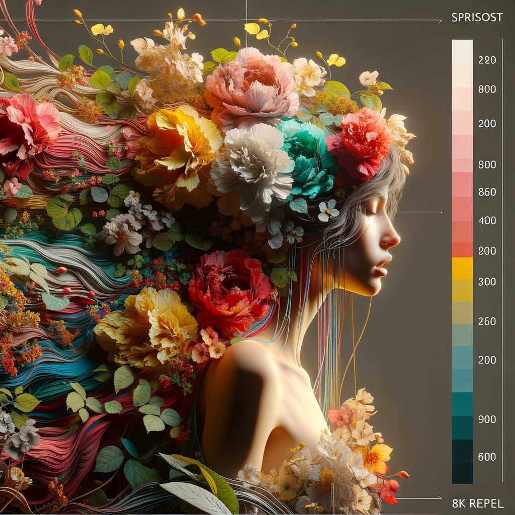 This image shows a woman in a dress made of flowers in a head and shoulders portrait. The digital art is dynamically lit and hyper-detailed, with triadic colors and volumetric lighting.