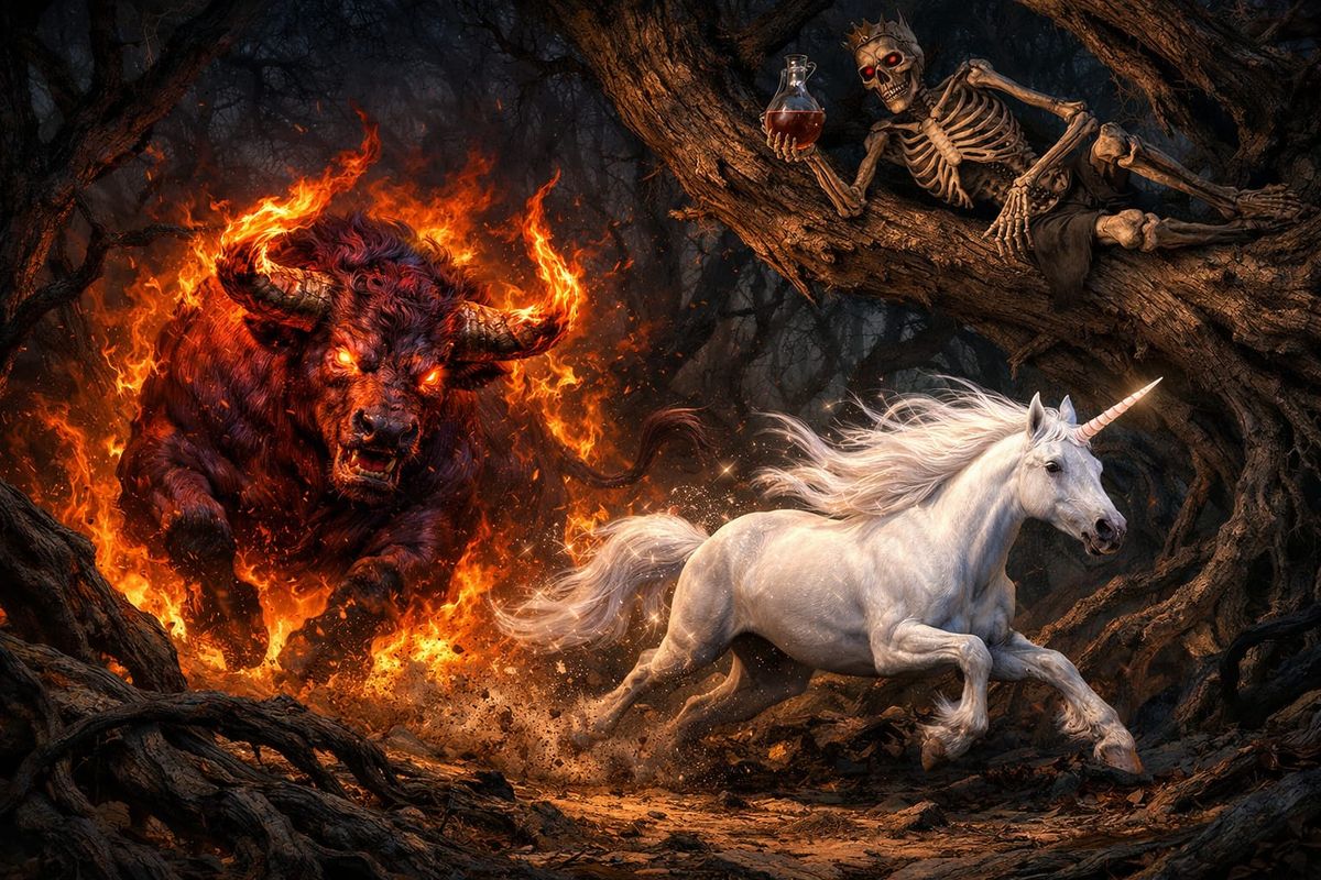 This hyper-realistic fantasy concept art depicts a flaming red bull pursuing a shimmering unicorn through a dark, gnarled forest. Dramatic lighting and intense motion convey a sense of danger and speed.