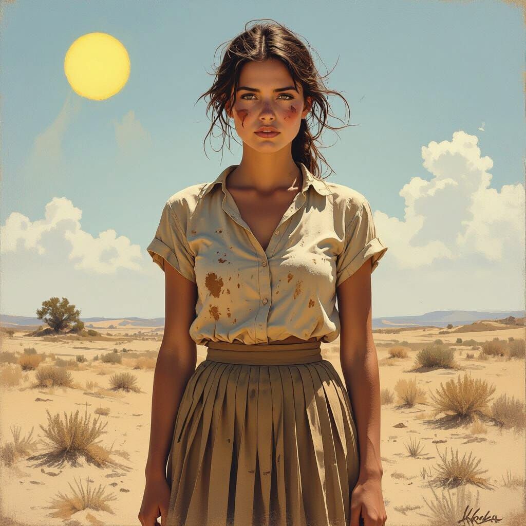 A realistic painting of a woman in a dirt-stained skirt and blouse, standing in an arid landscape. The artwork emphasizes harsh textures and earthy tones, capturing a sense of environmental hardship.
