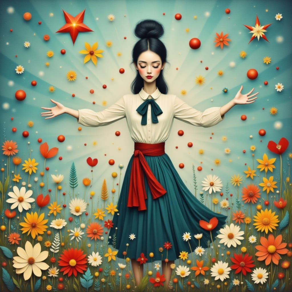 A whimsical illustration depicts a woman in vintage attire, arms outstretched amidst colorful stars and drifting spheres, in a joyful, storybook style.