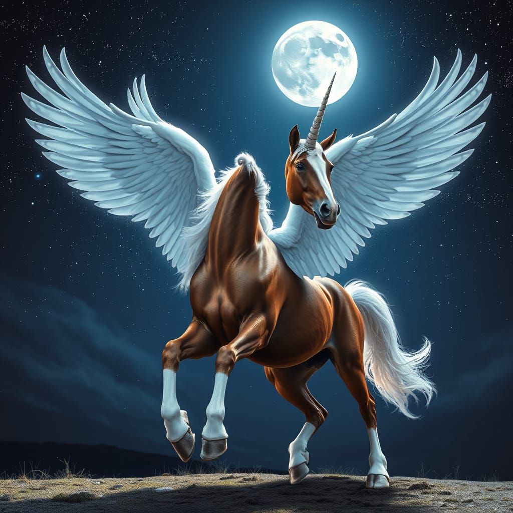 This image shows a large Pegasus-Unicorn hybrid under a full moon. The creature has a brown body, white wings, and a prominent unicorn horn, rendered as a holographic astral cosmic illustration.