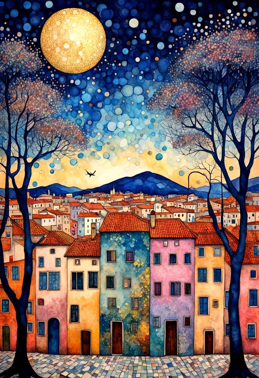 This image shows a row of houses in a modern urban setting with trees and street lamps. The artwork features a 3D effect with patchwork jewels and a hard stone texture. It is rendered in a watercolor and ink style with Art Deco elements.