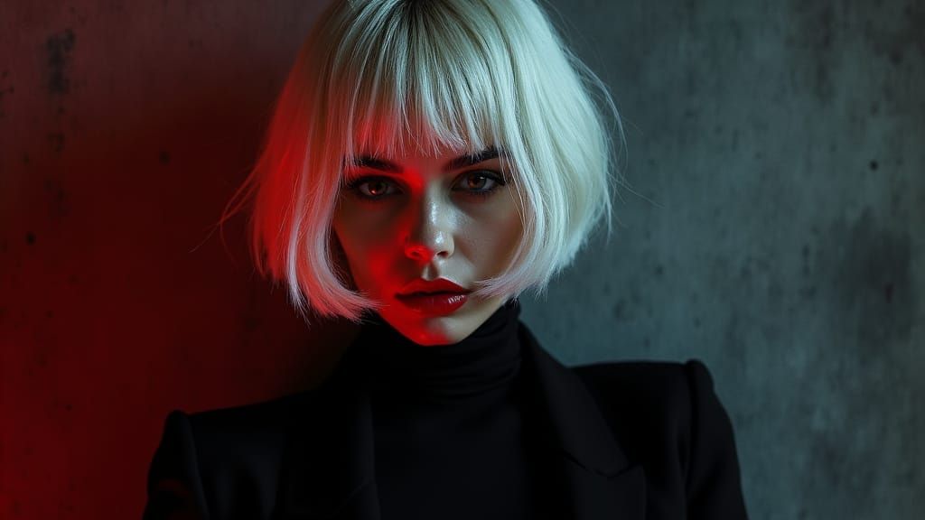 A striking digital portrait of a mysterious woman with an icy-white bob, piercing gaze, and bold red lips, set against a dark abstract backdrop with dramatic lighting and contrast, exuding allure, control, and hidden threat in a fusion of fashion and cyberpunk aesthetics.
