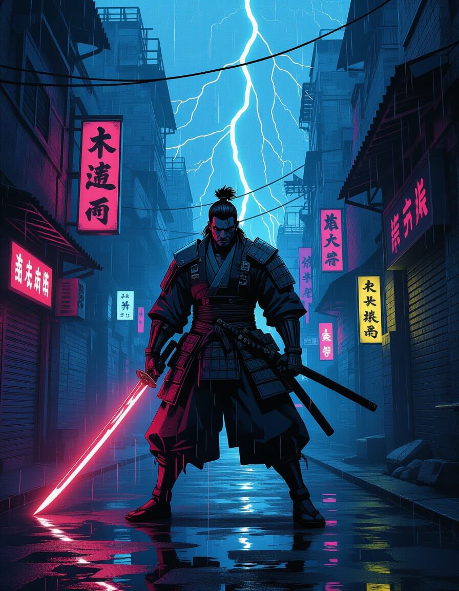 This image depicts a comic book cover of a cyberpunk samurai facing a shadowy bio-mechanical enemy. Rendered in a stark, high-contrast style with moody linework, it captures a dramatic, rain-soaked confrontation.