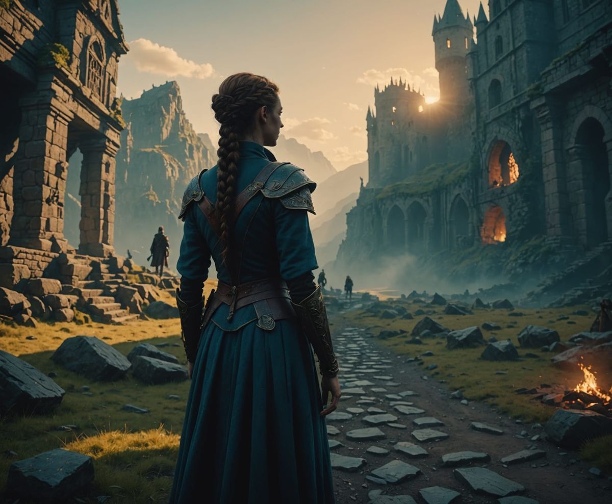 This image shows a vibrant fantasy world depicted as a cinematic film still. The artwork features detailed textures, warm lighting, and a dramatic, post-processed aesthetic.