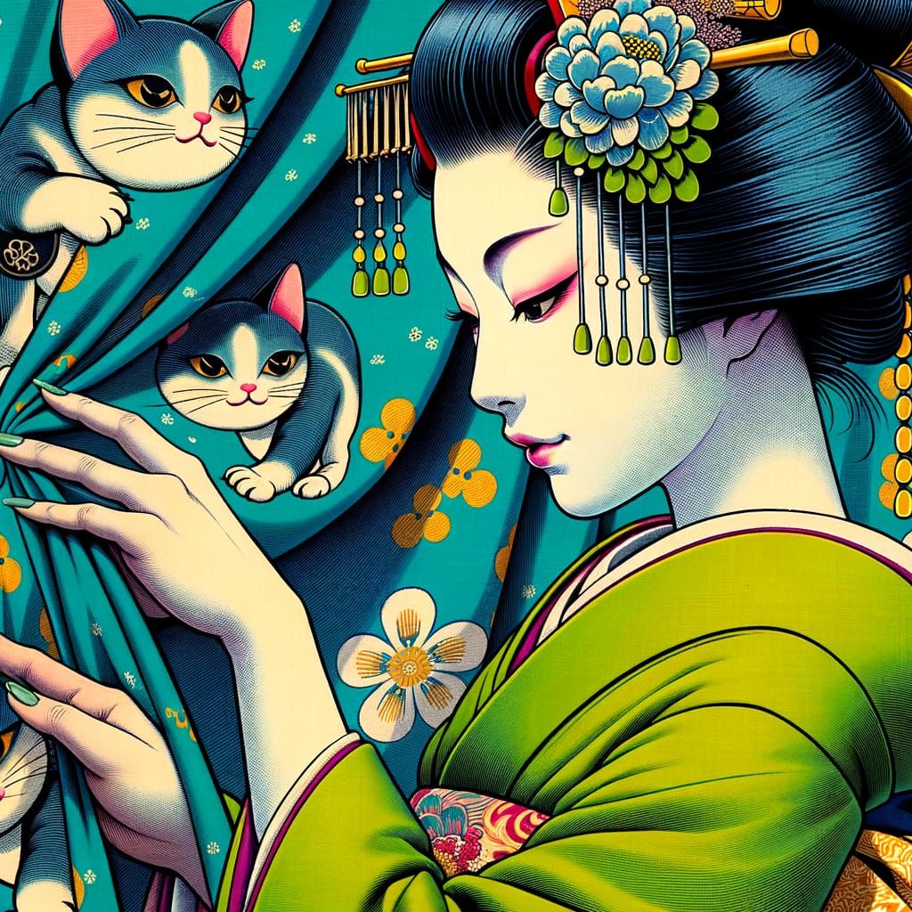 A striking picture of a geisha in a lime-green kimono. She is brushing aside a noren curtain decorated with cat motifs and gold and red accents, rendered in the style of old Japanese manga art.
