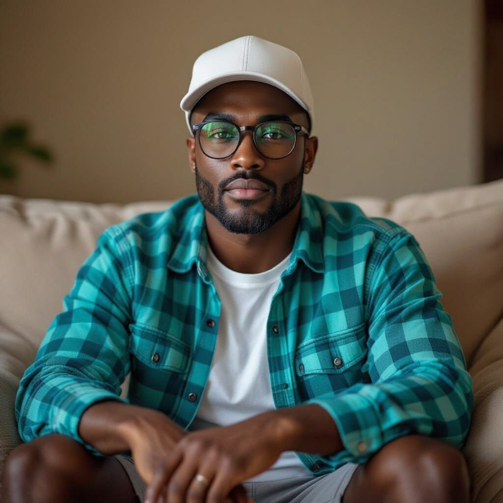 This image shows a robust 38-year-old man with dark skin, glasses, and a buzz cut, wearing an aqua flannel shirt and grey shorts. He is seated on a beige sofa in a realistic, high-definition photographic style with soft lighting.