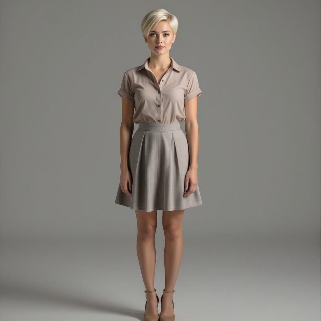 This image shows a full-length, hyperrealistic color photograph of a young woman with short hair, wearing a skirt, blouse, and heels. Captured with cinematic lighting and a shallow depth of field.