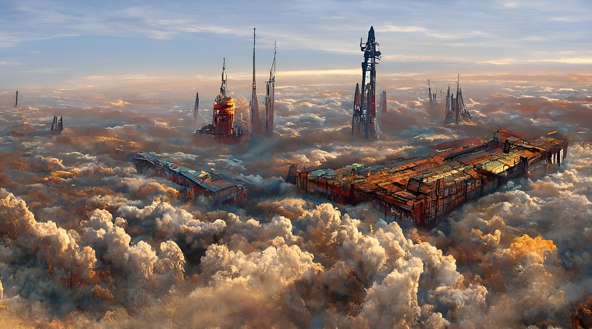 Well Composed, Incredibly Detailed Composition, orange and warm lights, spectacular view, wide composition, dust and particles, incredible depth , heavy brush strokes