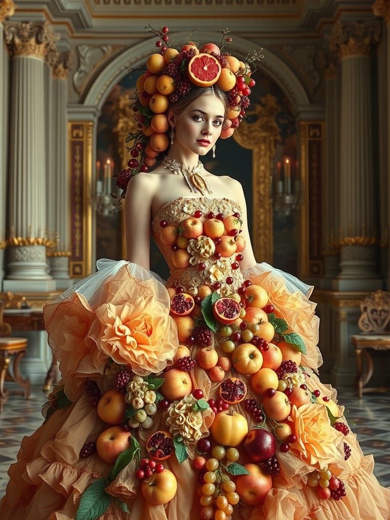 A hyperrealistic photoshoot of a model in a Rococo dress constructed from fruit. The image showcases a blend of Dutch Golden Age still life and high fashion, set within an opulent palace.