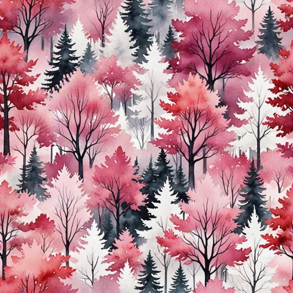 This image depicts a serene forest in soft pink and white hues, reminiscent of traditional watercolor techniques. A peaceful and dreamy landscape unfolds in delicate colors.