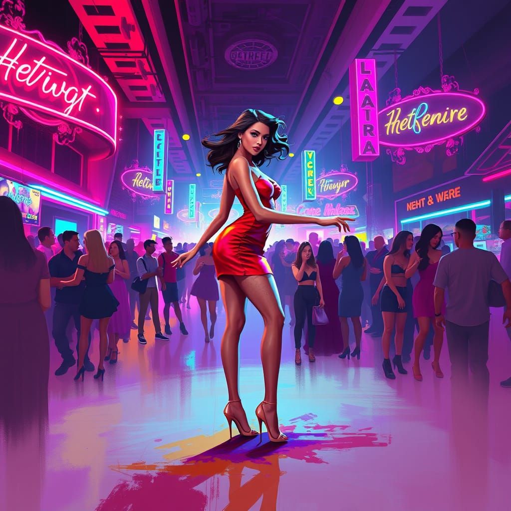 This image shows a vibrant woman dancing in a crowded nightclub under neon lights. The image is rendered as digital art with 3D elements, in a futuristic neon style.