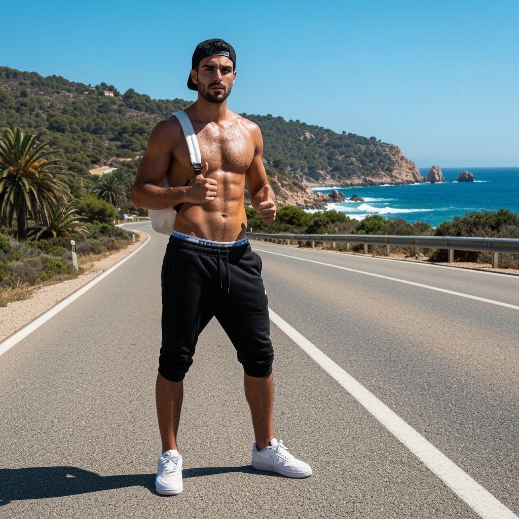 This image shows a fit, European man with a beard and athletic build, hitchhiking on a deserted Mediterranean coastal road. He wears sweatpants and sneakers, with a backpack and baseball cap.