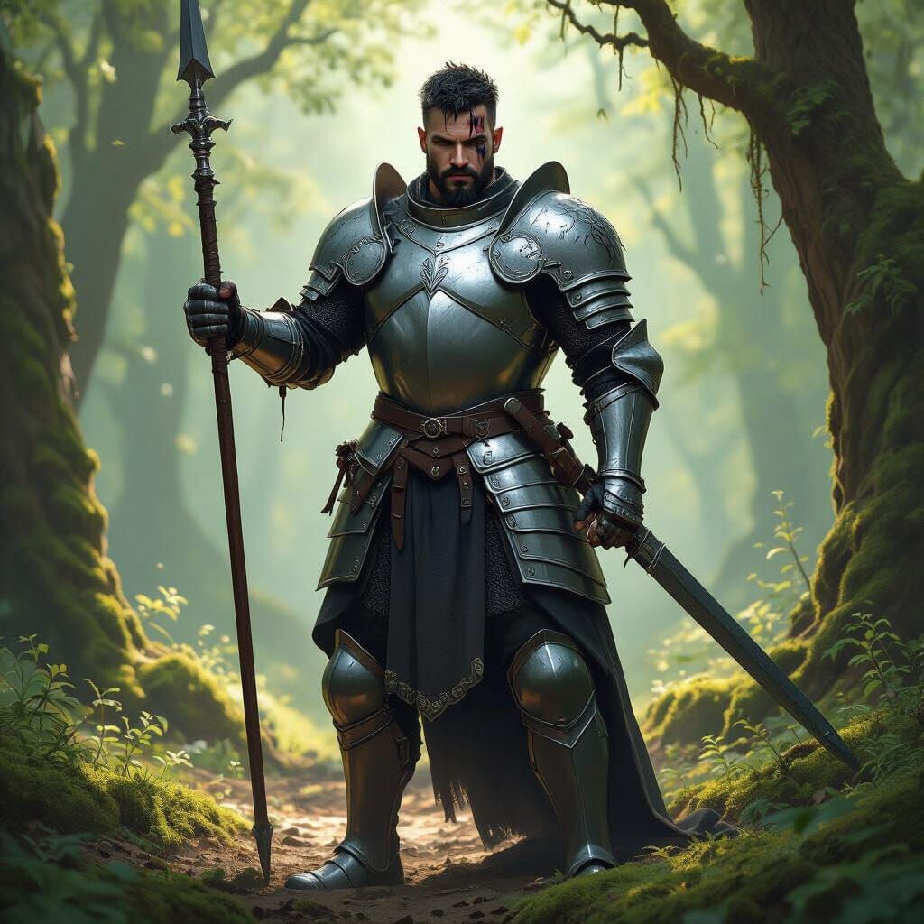 A hyperrealistic digital painting of a human warrior in full plate armor holding a lance in a sun-dappled forest. The art style is dramatic and high-contrast.