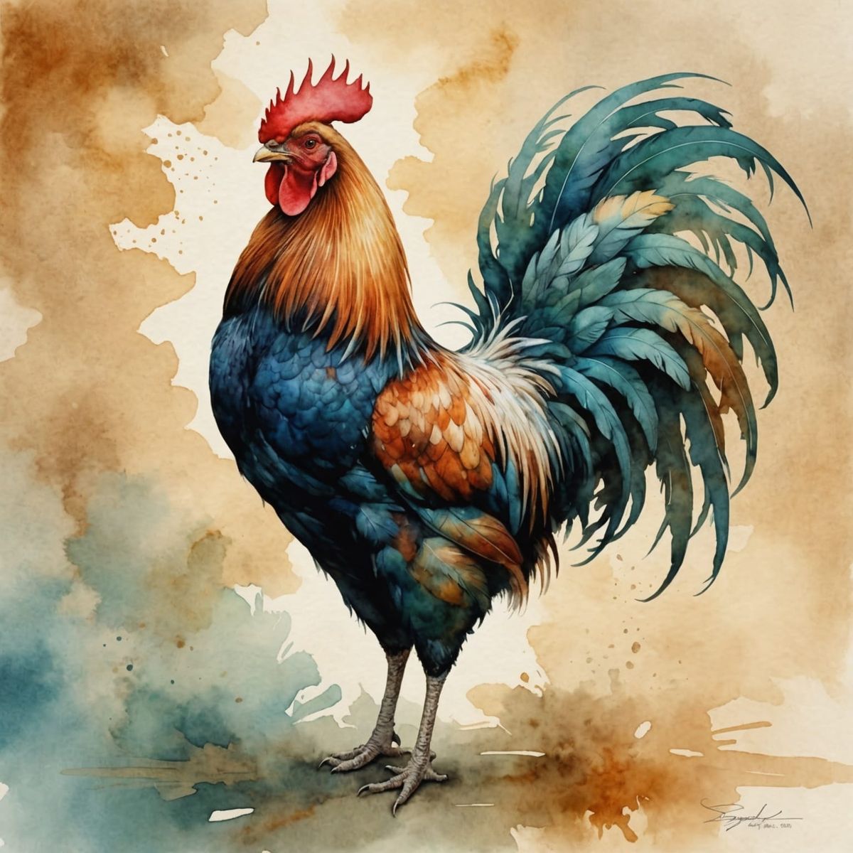 A vibrant watercolor painting of a rooster crowing. The artwork features soft lighting and a golden background, reminiscent of double exposure techniques and silhouette design.