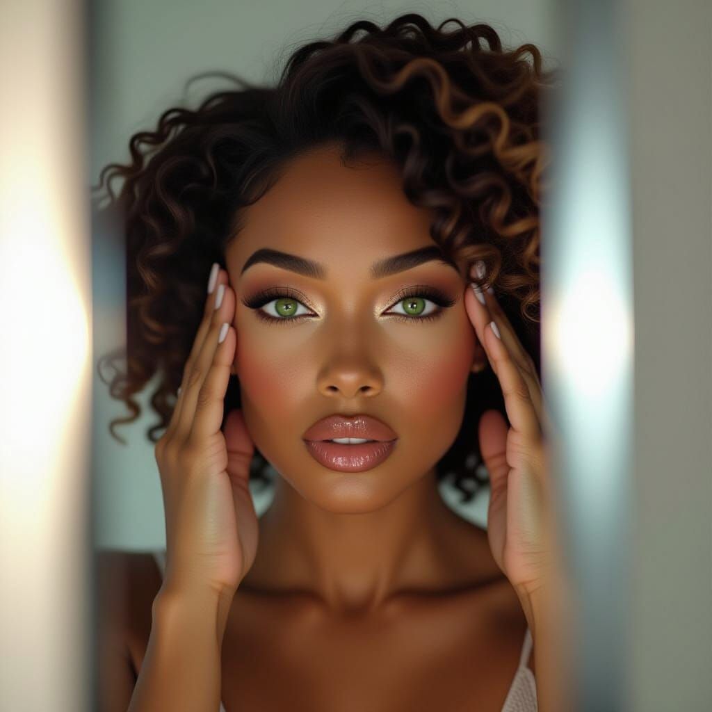 This image shows a caramel-skinned African woman with green eyes, breathing heavily as she presses her forehead against a studio mirror. The image is reminiscent of nostalgic 35mm film.