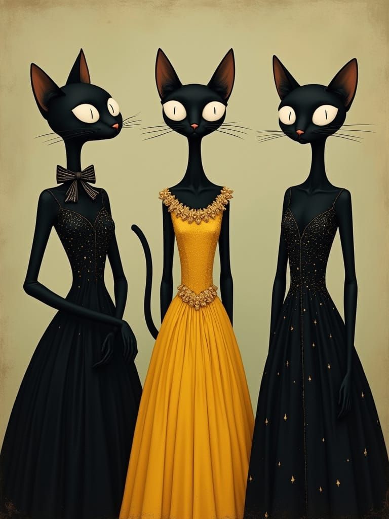 This image showcases three elegant black cats standing upright, adorned in long, ornate dresses. The center cat wears a golden yellow gown, while the others are in black. Rendered with stylized proportions and a surreal, artistic atmosphere.